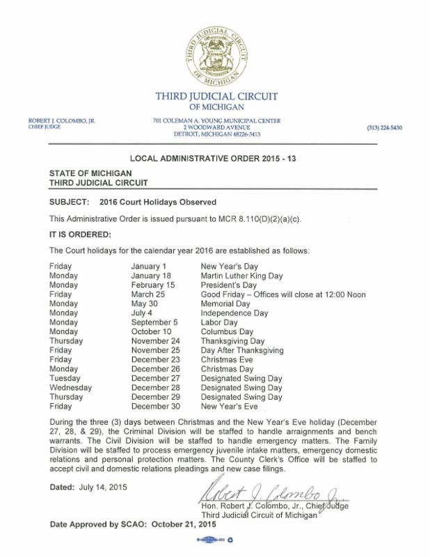 The Michigan Legal Help Self-Help of Wayne County will offer limited services during the holiday. The Center Navigator will be in Room 901-E of the Coleman A. Young Municipal Center on December 28th - December 30th from 9:00 a.m. to 4:00 p.m.