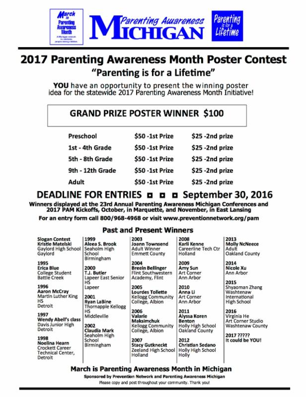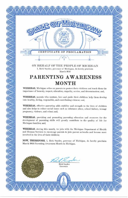 Governor Rick Snyder has proclaimed March 2016 Parent Awareness Month in Michigan. The proclamation acknowledges the important role of parents as they teach children the importance of honesty and respect and they guide children to be responsible and contributing citizens.