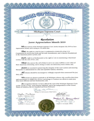 The Michigan Supreme Court has designated July as Juror Appreciation Month. In honor of Juror Appreciation Month, jurors were given candy, a Third Circuit Court pen, and other small swag as a token of appreciation. The Third Circuit Court recognizes the valuable part jurors play in the judicial process and will continue to work and identify ways to improve the juror experience.