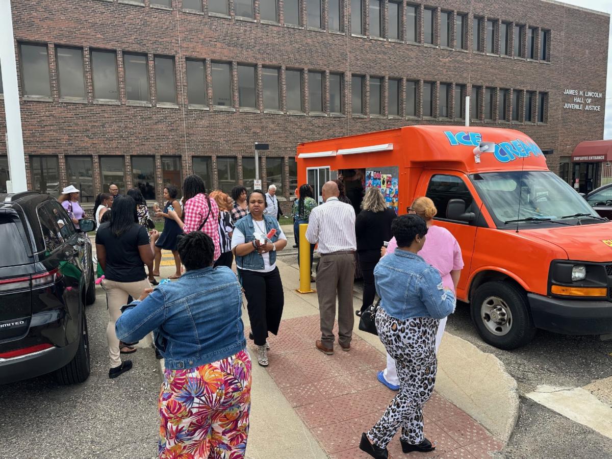 Many thanks to the members of our Family-Juvenile Bench, Interim Presiding Judge Sheila Ann Gibson, and Judges Karen Braxton, Todd Briggs, Jerome Cavanagh, Judy Hartsfield, Aliyah Sabree and Adrienne Scruggs. We had a great turnout at the ice cream truck on a sunny, warm (but not too humid) day! According to an email from Judge Braxton: