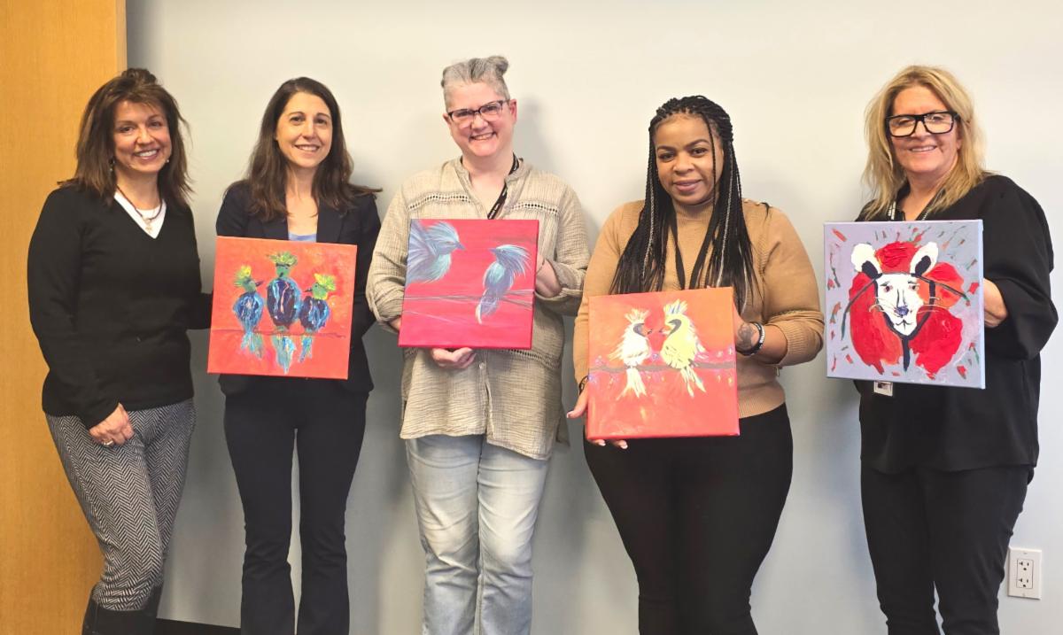 Above: Judge Patricia Perez Fresard, Fran Yturri, Arica Jones, Charlene Dozier and Nancy Hames show off their paintings following their session with Judge Fresard.