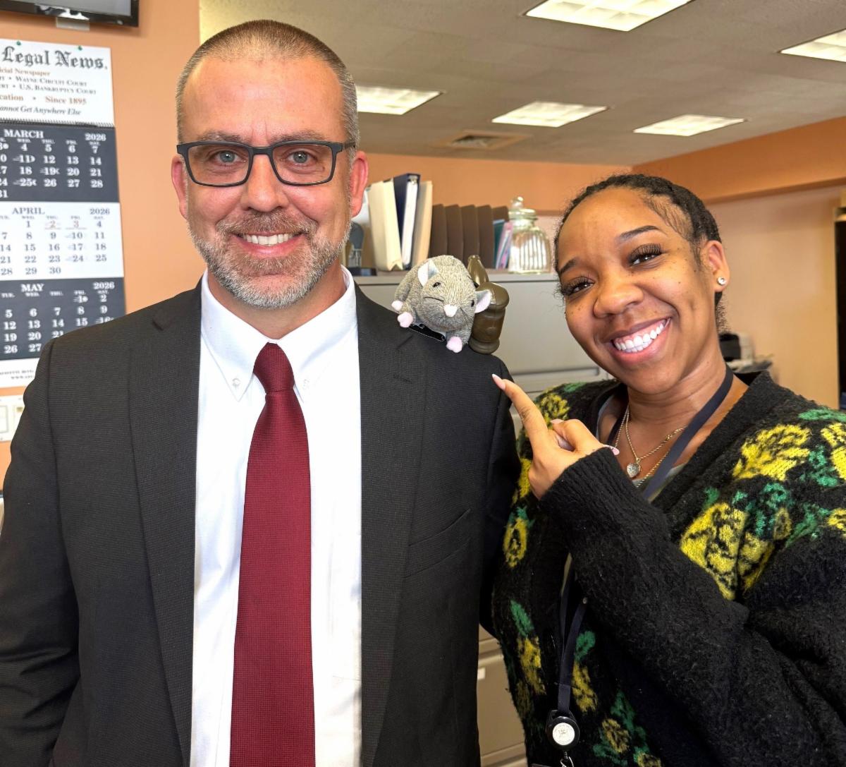 Mickey, shown here on the shoulder of Executive Court Administrator Frank Hardester, and next to Payments Clerk 2 Brittany Settles, is available for staff and departmental events. Reach out to the ECA office to schedule an appearance.